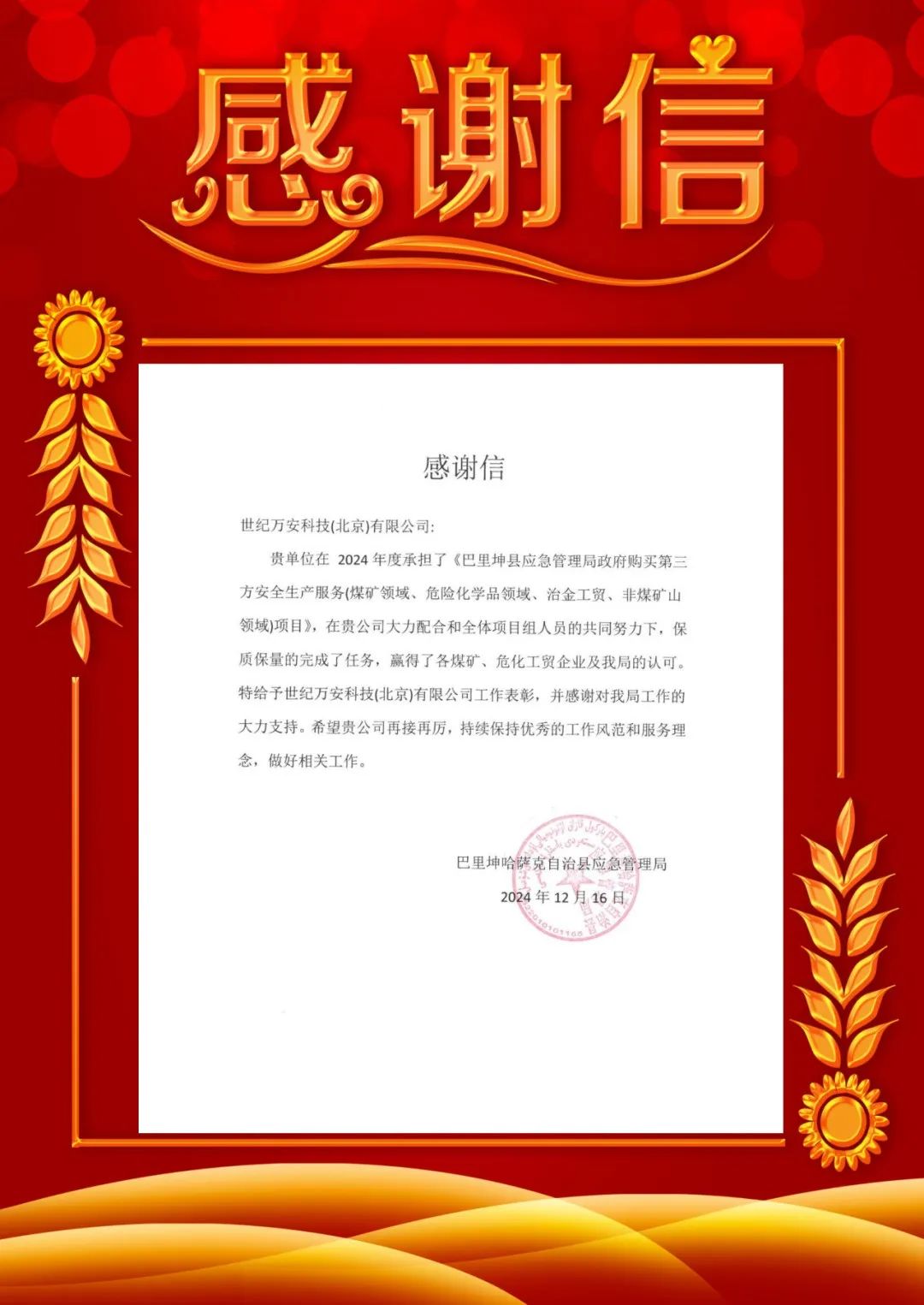 世紀(jì)萬(wàn)安公司助力巴里坤縣安全生產(chǎn)提升 應(yīng)急管理局致函感謝